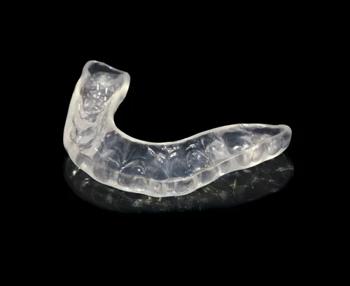 This all-flexible EVA material is used in cases with sensitive or missing teeth, or an unusual draw. It is also used for athletic mouth guards. The standard, even thickness is 3mm, and thickness can be added by request. It is soft/flexible in the mouth and contoured.