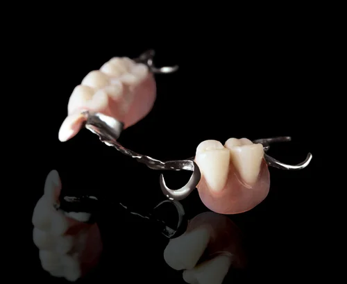 A cast partial denture consists of a metal framework for retention, combined with tissue colored acrylic and replacement teeth. Partial dentures are used when one or more natural teeth remain in the upper or lower jaw.